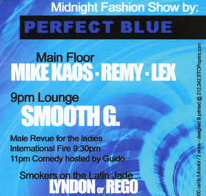 This will be a great Saturday Night Party with Special Midnight Fashion Show By: Perfect Blue. Music in the Main Room By: Mike Kaos, Remy & Lex and Lounge: Smooth G & Lyndon or Rego. 10-11pm Comedy show hosted by Guido in the lounge and Smokers corner on the Jade Terrace.